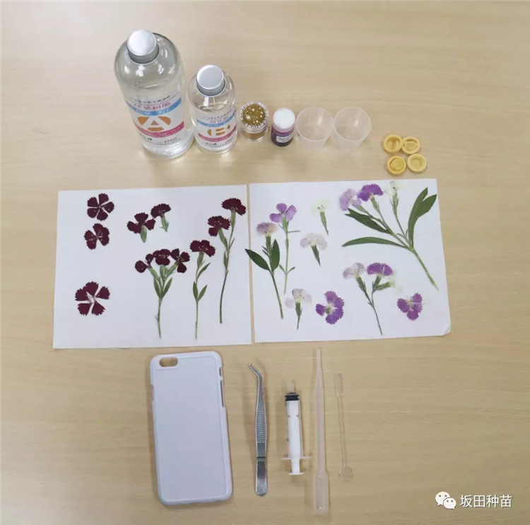 制作材料与工具:空白手机壳(新手建议背面有凹槽)、押好的干花、水晶滴胶(AB胶)、胶水、一次性塑料杯、针筒、剪刀、镊子、木棍、牙签、纸巾