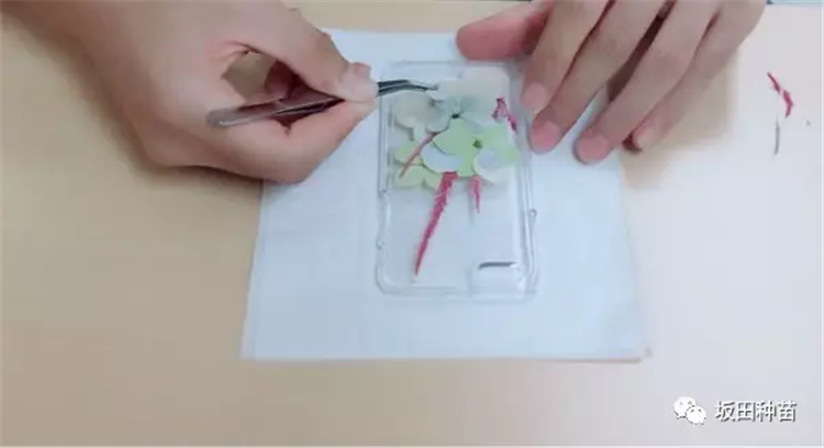 将押好的干花分类整理好,方便取用。用镊子夹取干花放在手机壳背面,按照自己的设计提前摆放好,并拍照,方便后边查看。