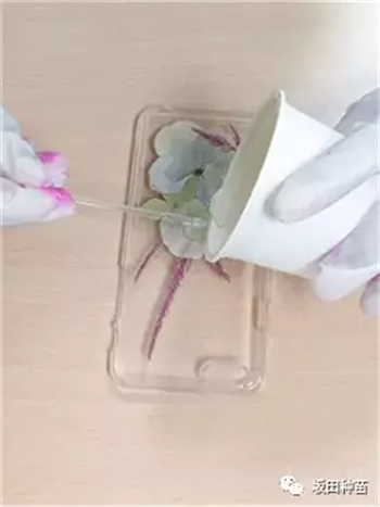 将配好的水晶滴胶从手机壳中间慢慢倒出,先少倒一些,以防后边溢胶。